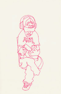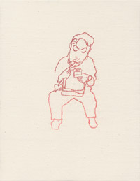 ANTIくん 絹糸、キャンバス / 19.0 x 27.3cm(P3) / 2006 電車にて。音楽聴きながら本読みながらの若者。 実は文字は一部省略されています。