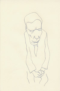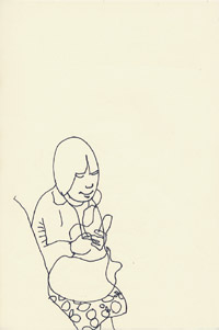 大畑君、横。 絹糸、キャンバス / 22.0 x 27.3cm(F3) / 2006 展覧会のオープニング終了後、一杯のお茶を飲む大畑君。