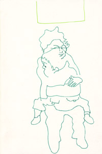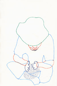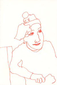 PEASE (辻井くん) 毛糸、キャンバス / 38.0 x 45.5cm(F8) / 2007 青山のA to Z cafeにて。アーティスト辻井くんほか3名と夕食を食べながら。 右手がふたつに見えるのは、描いてる間も仕草が変化しているから。