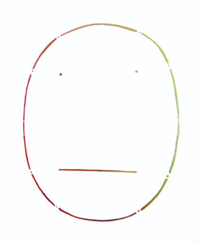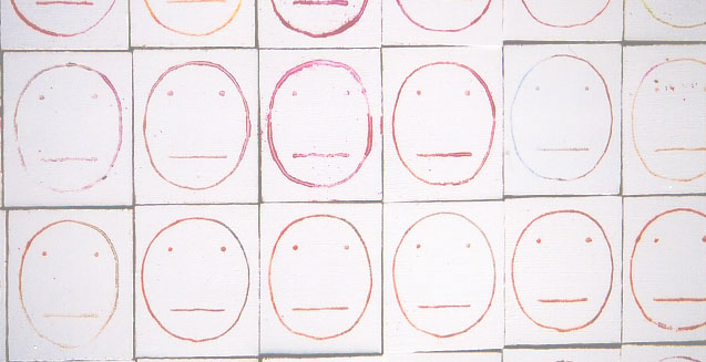 「かお」の原案...らしきもの..が出てきたのは、個展開催の半年ほど前。 「作品」として出展したのは、00年11月の多摩美術大芸術祭でのグループ展にて。 この時のタイトルは「いろんなかお」。 colored faces........最初は色がついていました。。 フルカラー211パターンの連作、ただしすべて「同じ」かたち。すなわち、 「おんなじだけど いろんなかお」