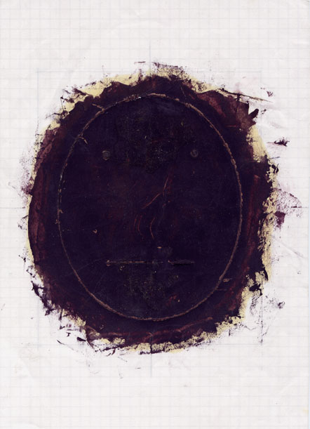 厳密に言えば、全ての色を混ぜるべきだったのかもしれませんが、 クリムゾン(赤)、コバルトブルーdeep(青)、イエローオーカー&ローシェンナー (黄土)を混ぜた色(黒)で、白い紙に転写、 どっさり出来た滲みをPCを使って少しずつ慎重に削り、 色も微調整。現実のものとイメージ、両方に近付けて、完成! (さらにこれを思いきって白黒コピーしたのが、 後にラクガキされることとなる「かお」なのデス。) ![]()