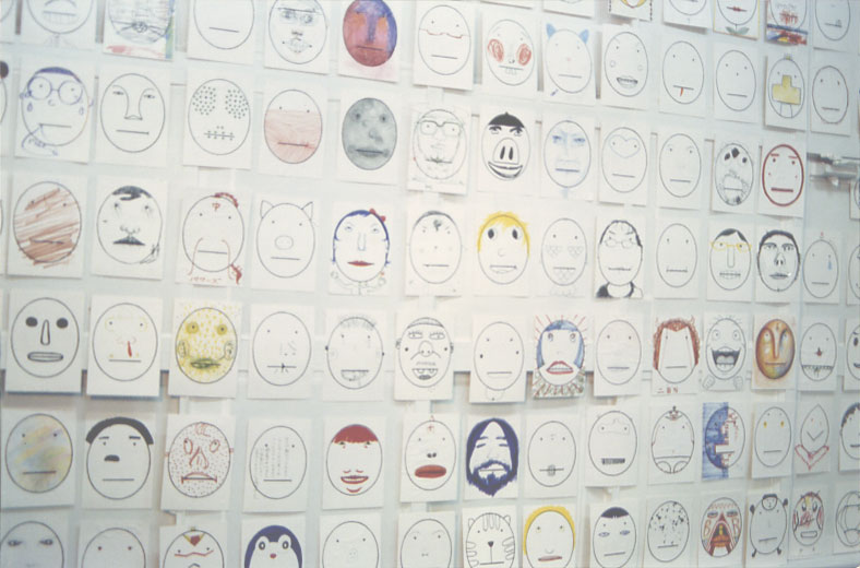 「芸祭」でのグループ展にて。 会場は、ぼくたちのアトリエ。(after 突貫大掃除) 一面窓ガラスを、白の段ボール、厚紙、テープなどで完全に覆い、 そこに、いままでのコレクションからランダムチョイスした「いろんなかお」を展示。 そしてテーブルと画材、「かお」on paper を用意して、お客さまを歓迎~。 右側の壁面にはクロッキーの拡大コピーや、ドローイング(らくがき)、 「かお」oil on canvas、等を展示。 絵を描く、ライブなかんじをお伝えできたのでは..と思っています。