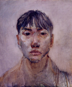 自画像 (Self-portrait 1998 oil on canvas 53.0x45.5cm) 20歳。2浪目の冬。 自分の顔を鏡で見ながら、だけど、かたちが狂って るだとかそういうことはあまり気にせずに描いた自 画像。なんだか父にも似てる気がするし、黒ぶちの 額に入ってるその姿しか知らない祖父や、婆ちゃん の弟にも雰囲気が似てると思った。0才で亡くなっ た弟がもし成人してたらこんな感じかな?とも想像 した。この男はいったい誰なんだろう..? ..................って、ぼくだよな。やっぱし。 In the winter when I was 20 years old. I painted this looking at my face with a mirror and not minding the shape was certain or uncertain. I felt this looked like my father & my grandfather. And I imagined my littel brother who had gone at age 0 would looked like this if he could had grown up. Who on earth is this man? ......As you know, this is me...yes,yes.. |