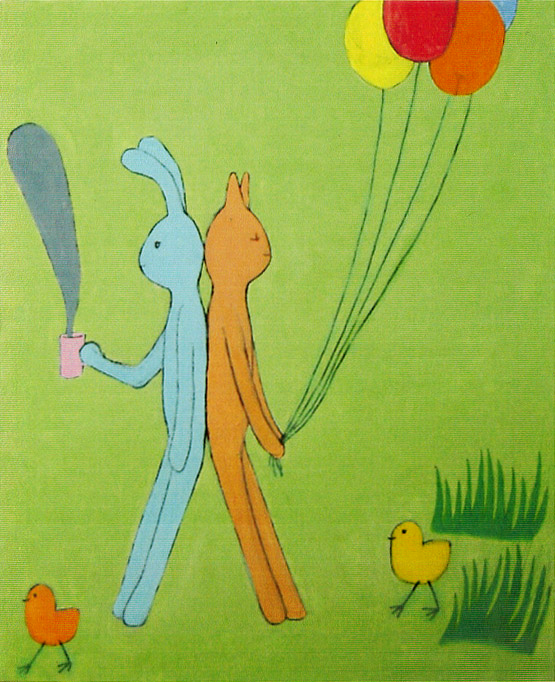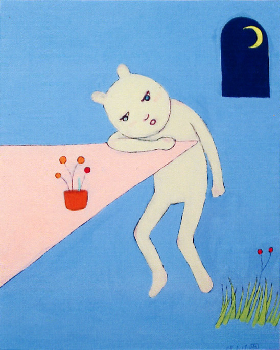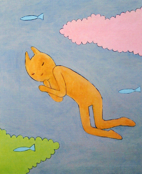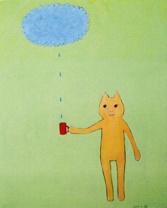 日々の生活の中から思いついた事をふくらませて作品にしています。 気まぐれから生まれた登場人物達(ネコやらクマやら色々)は 私の分身、あるいは双子のかたわれの様な存在です。 私は夢や希望や欲望や悲しみを彼らと共有しているのです。 作品はその時の自分の記録、日記のような物に近い。 (作家にとって作品とはそういう物なのかも) 過去の作品を見るとその時の気持ち、感情がよみがえります。 時間は、止める事ができません。 ただ淡々と続いていきます。嬉しくても悲しくてもどんな時も。 それは好ましいことだと私は思うのです。 それでもその時の感情を描きとめてしるしておきたいのです。 形にあらわして自分の目で確認したい、見てみたい。 そういう強い願望があります。 表現方法は変わっていくと思います。 私にとってより実感をともなう方法に。 もっと抽象的な表現になるかもしれないし、風景とか違うものを 描いていくかもしれない。 だけど、根本的な所は変わらない(変えられない)ように思います。 好きな絵を、好きなように描いていく。 それは、自己確認のような作業になるのかしら? 言葉にしようとするとなかなか難しい。 今の目標は、 描きたいものが描きたいように早く描けるようになること、 そのための技術が欲しいです。 野望は、絵で食べて行けるようになること。 2005年5月1日 吉野直美 |