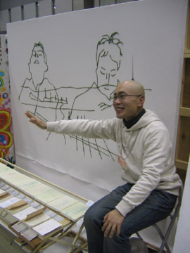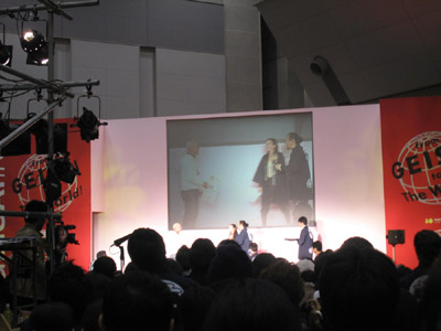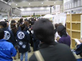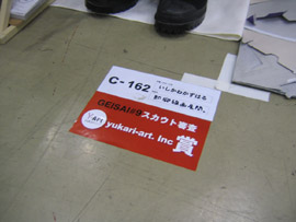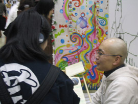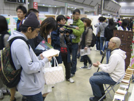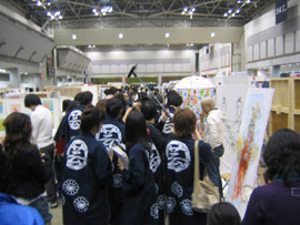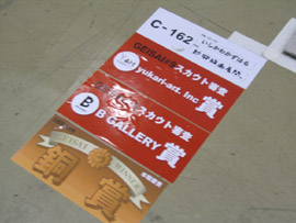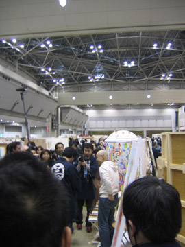 午前9時、ステージ前に全員集合! 赤く塗られた両脇のパ-テ-ションには、 バシッと「 from GEISAI to The World ! 」と書かれている。 チアマン挨拶。審査員やスカウトさんと出展者顔との合わせ。恒例の集合写真撮影。 いよいよGEISAI#9のスタート。 それぞれ、自分のブースに戻ったり、うろうろしたり...。 審査の方もさっそく開始。 午前10時、開場。お客さんが流れ込む。 審査は、公開審査。 先ず、審査員5名それぞれが会場内を歩き回って、ピンとくるブースをチェック。 次に、別室にて、チェックの入ったブースの写真が机上に提出され、しぼり込み開始。 そんで、今度は全員で、候補ブースを巡ってまた別室へ。審査もこれで詰めへ...。 という段取りで行われている、ようです。 だから、居ながらにして分かってしまうわけです。 「ありゃ~、こりゃダメだなぁ」という感触。しょうがないです。 と、思っていたら、 突然、スタッフの人がやってきて一言。 「今から審査員の方たちが来ますので。」 へぇ~。来るんだ~。近くに~。 | |