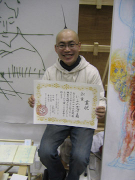 予定を合わせて来てくれたみなさん、ありがとうっ。 出会えたみなさん、こんにちわ。 いそがしいのは嬉しい悲鳴だけれど、 ひとりひとりの方とじっくりお話できる時間が持てたらな~と思います。 今回、銅賞をいただきましたが、まだまだこれから。 自分自身の、わがままな感性に従い生きてく覚悟です。 合わせて、自分の中にあるものを人との間においてみる、 そのバランスをいろいろ遊んでいこうって思ってます。 そんなわけで、今後ともよろしくっす! 2006.4.12 いしかわかずはる |