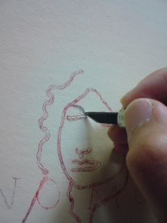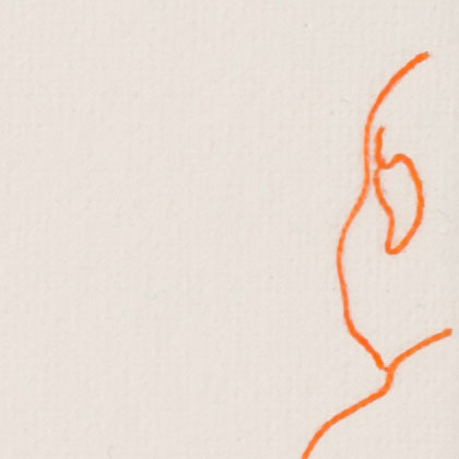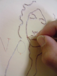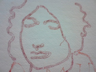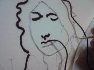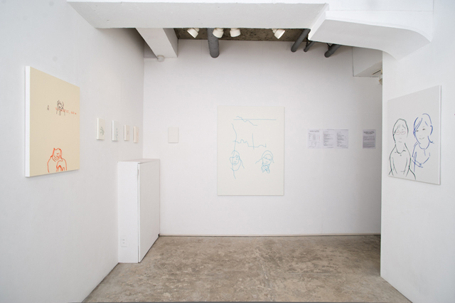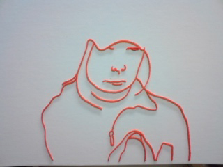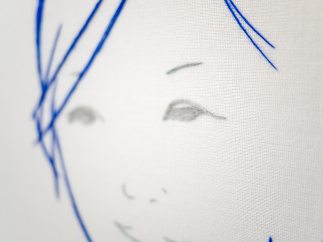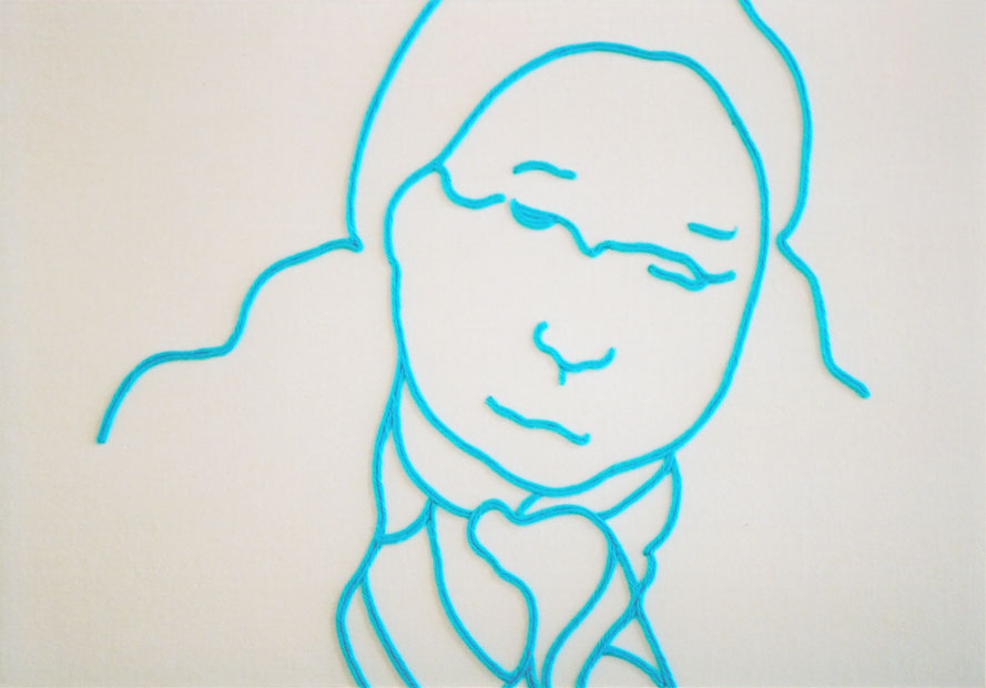 photo:川本史織, (C)いしかわ, courtesy of かずはる&ユカリアート・コンテンポラリー 「お二人」 直島にて、民宿で会った二人。(新婚さん) 僕のドローイングは、ボールペンで描くことが一番多い。 滲みや掠れや強弱といった筆の味よりも、程よく均質なボールペンを選ぶ。 この均質で有機的な線を、実在させるのにぴったりなのが、糸 というわけ。 長いことやってるうちに、「ペンで捉えた線を、糸で表出する」というのが定番のセットになってきた。 しかし、「糸で表出する」事を念頭においてドローイングをしているわけではないので、 うーむ、「糸で描くこと」を一旦忘れた方がいいのではないかと思うことがある。 同じ形式を繰り返すことで、気付かぬうちに惰性に陥るのはイヤだし、 きっと新しい表現を切り拓いていくべき使命のようなものがあるはずだろうと。 そんなわけで実は今回、 元のドローイングは「糸にはするまい」という思いもあって、敢えて筆(筆ペン)で描いたのだが、 結局、このお二人のふんわり穏やかな雰囲気が、ど~うしても、糸の柔らかなイメージに 結びついてしまったのだ。 うう...「糸にしたい。」 しかし、糸は均質。対する筆の線には太い/細いや掠れがある。 毛糸の多重螺旋をほどいたり縒りを調節したり、繊維を散髪したり...様々な手を加え表現した。 バックは、ガーゼを使用。絵具は一切塗らず、そのままの色と質感を採った。
