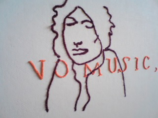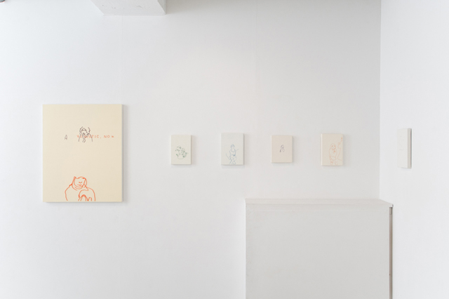 photo:いしかわかずはる, (C)いしかわ, courtesy of かずはる&ユカリアート・コンテンポラリー 「 NO MUSIC 」 電車内の光景。 描かれているのは、 網棚の上の横長の広告と、その下に座っている人。 広告は、レコード店とお酒の会社とのコラボレーションで、 ミュージシャンがまったりウィスキーをたのしんでいる写真と、 キャッチコピーが組み合わされている。 たぶん、広告の中の人から描き始めたのだと思う。 文字の部分は、「文字を読んで書き写す脳」と「形を見て描き写す脳」と 両方が動いている。文字が不完全なのはそのため。(..という気がする) 木製パネルに布を貼り地塗りを重ね、平滑な明るい黄色の四角を用意した。 この面を基準として、その手前と奥へ±1cm未満の層構造を形成して表現した。 広告の中の人のところは、溝を彫って糸を埋めてある。 文字は、浅い溝に軽く座っている。 手前の人物は、細い糸で一度描いた上にさらに、一段階太い糸を盛って描いた。 広告の中の人物も現実の人物と同じ画風で同じ画面に描くと、 写真の像なのか実際そこにいたのか、どっちだか怪しくなる。 それはそれで、もちろんOK。だが、 ノートに描いた絵を、糸に換えて起こすのは、 捉えた「線」を、もう一度現実に送りだしたいから。 そのために、糸の物質感を必要とするのだが、 広告の中のこの場に実在しない人物については、このバランスを調節したいと思った。 紙にインクが染みるのと同じようなイメージ。 そんなわけで、キャンバス表面のほぼ内側に収まっている。 逆に実在の人物は、「盛りたい」と。