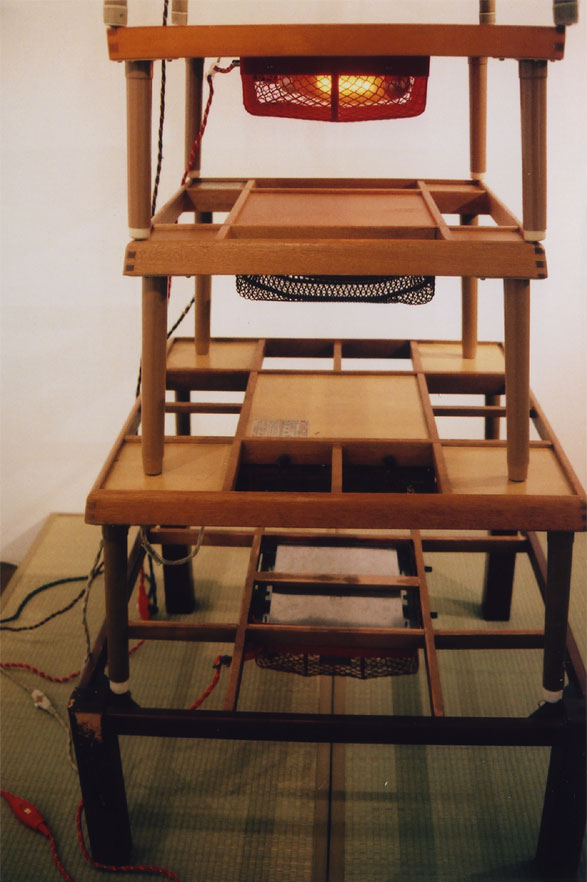 photo:和治, (C) 泰平, courtesy of 泰平&ユカリアート・コンテンポラリー 「通信」 昭和の香り漂う電気コタツが積み上げられ 順番に点灯消灯を繰り返す、という作品。 ギャラリーの入口を入ってすぐが、いしかわ作品、 同室の奥半分が、淀テク、そして、廊下を五歩歩いて第2室へ。 そこに、どんと現れるのが、泰平の空間。 パッと見、可笑しな印象とは裏腹に、ここに長居する人は多かった。 魅入られる何か。 ずっといると、微かな音が聞こえてくるのに気付く。 かち、かち、かち、かち.... 点滅とともに音が鳴っている。 「BGMを流しているの?」と聞かれたりもしたが、 ノンノン。ランプ自体が点くとき鳴るのだ。 ランプに手を近付けて温かさを確かめようとする人もいたが、 実は、熱はあまり出ていない。 光も眩しくはない。 弱くはないがずっと見ていられる光量。 実は、ちゃんと制御されている。 10cmほど底上げされた土台の下に仕込まれた機器に 全てのコードが繋げられ、電気の量と通電のタイミングが 予め設定されている。 それは、容量や安全のための現実的必然であると同時に、 表現の要点を示していると言えると思う。 つまり、 「点く/消える」の「連なり」が、目の前に提示されている というただ単純なそれだけのこと。 そのためのコタツの塔なのだ。 作者の超クールな意図と、 「コタツ」に対する観賞者の先入観との、強烈なギャップ。 説明されちゃえば何もかも明らさまなはずなのに、なんかずっと謎謎な感じ。 自ずと、作品の前では様々な会話が生まれ、お客さんたちのシナプスが弾ける音が 聞こえるかのようだった。