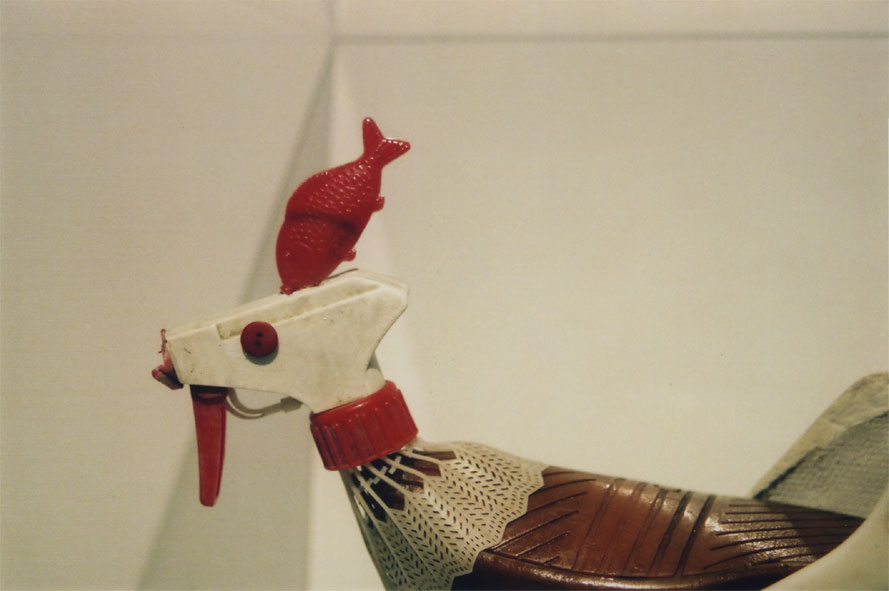 にわとり(赤頭) 元・スニーカー、スプレー、しゃもじ、 をはじめ、ご覧の通りの様々なゴミたち。 手の仕草や身体の動き、何気ない記憶が自ずと思い出される品々で構成される逸品。 生活感たっぷりである。 炊事洗濯ok、布団も干せるし身だしなみも整えられるし、お出かけもばっちり、 文武両道で尊敬出来る。ほんの一差しお醤油をつけてくれるところも気が利いてるねぃ。 ちなみに作者によると、 靴紐がくるくる~っと洗濯バサミを巻き付け最後にぴゅっと、鉤爪になってるところ、 「ここを見てほしい!」とのこと。さりげなく高度なローテクである。