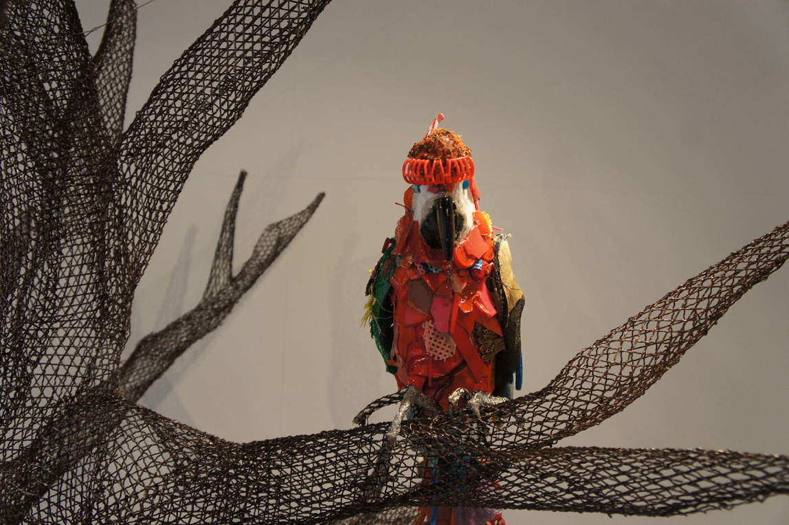 インコ(信号) 赤、青、黄色、色とりどりのゴミ。 とっても鮮やかだが、無着色。 プラスチック片など、わりと細かな物が集積して、羽の感じなんかけっこうリアル。 一方で、ゴミが只の部品になってしまわぬよう、気を付けているとのこと。 「こういうのが重要なんです。」と指差ししめされたのは、黒ずんぢゃったヒーローフィギュア。 確かに、ときには気持ち悪いくらいのゴミらしさがいきいきと生きている...。 尾羽の魚肉ソーセージの包装フィルムとか、頭頂部とか、ちょっとえぐいぜ。