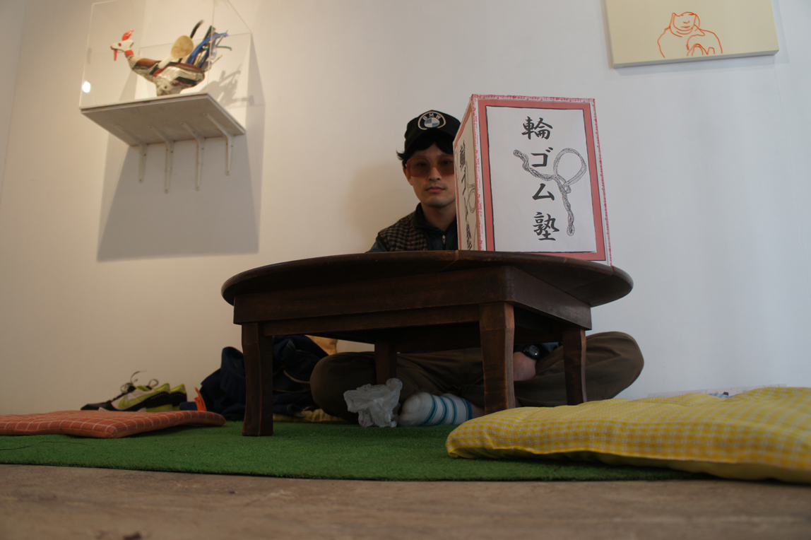 「輪ゴム塾」 展覧会初日に行われた、淀テク柴田英昭によるパフォーマンス。 柴田を講師しとし、誰でも参加自由な、少人数対面制の塾。 講師の指導のもと「輪ゴムとより仲良くなる方法」を学ぶ。 受講後は、より以上に世界を愛して生きていけるような気持ちになる。 なんと、淀テク結成以前からあたためられてきたアイデアらしく、 淀テク創作の原点に触れられる、深イイ塾である。 ここでは詳しく語るより、体験することをお薦めしたいと思う。 (いつかきっとまたどこかに現れるはず...) 当日、「なにここ、酒臭い!」とのクレームが数件あったが、 これは、「講師は呑んだくれている」という厳格なコンセプトによるものであったことを、 明記しておく。 蘊蓄... 淀テク / 泰平 / いしかわ / 総括 写真... 淀テク / 泰平 / いしかわ / 総括 |