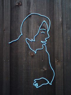 「 あ、うん 」の「 あ 」の方 毛糸 on 焼き板外壁 of 松島酒店, 2010 バスでも徒歩でも、たいへん重要な導線となる道から 南へ入る路地のうちどこか一つ、 その入口のどこか一箇所に一点、描きたいと考えていました。 選ばれたのは、松島酒店さん。 い〜味出てる古い酒の看板もあって、このままそのままが一番ではないかと 悩みましたが 最終的には、他のどこでもなく「ここだ ! 」と決断しアタックしました。 おしゃべりしてる人の絵。 さらっと描いとるようですが、素地を傷めぬよう最低限の力でくっつけてます。 よく見るとけっこう激しい凹凸の付いた、しかも黒炭ざらざらの表面に ふわりと毛糸がのっている、この技術。ぜひ誉めてね。 |
