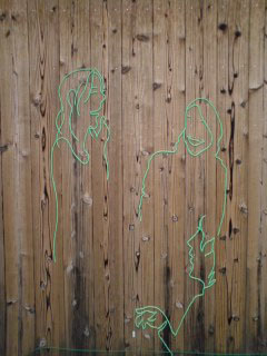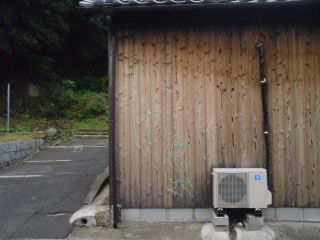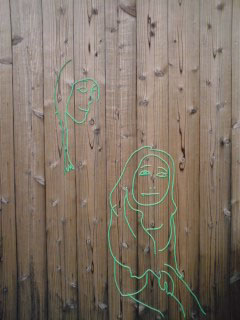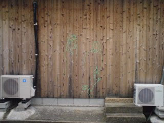 「 わになって談笑 」図 右隻左隻 毛糸 on 焼き板外壁 of 民宿石井商店ヤドカリ, 2010 笑顔と会話。 人が集まる場所なので、群像を描きたいと思っていました。 当初 暖色で描き始めたのですが、あおあおと揺れる木々に囁かれて「いや、違う!」と、 敢えてこの緑色の毛糸を選びました。 ちっこくサイン入れてあるので、現地で発見してね。 INDEX // 「少年」くん / 「あ、うん」の「あ」の方 / 「ちろ」図 / 「くたりねこ」図 / 「あ、うん」の「うん」の方 / 「はるのは」 / 「わになって談笑」図 / 「はるのは」 / 地図 |