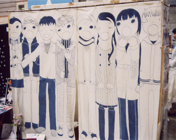 photo by kazuharu ↑藤永 結さんの作品。高さは180cmくらい, のれんチック。 奥行きわずか1mなのに、のれんの裏は控え室。のれんの前方・床面には絵本、作品写真ファイル などが置いてありました。 絵本には見開きごとに日常生活を題材にした群像がひたすら描かれていました。 ファイルで注目したのは、中学校の教室のカーテンの写真。↑のれんと同じく、白地に単色、線で 描かれた無背景の群像。のんびりしてる生徒達の図。いいかんじ。 居心地の良い線、そのセンスがどんな場面にも広がっていて、goo !! |