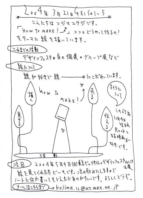 (c) Kojima Yuji ↑コジマユウジさんのリーフレット。 展示&販売されていたのはB5ぐらいのドローイングとポストカード。たくさん。 真っ白な紙にスルスルッと描かれた線... ↑このキャラクターがいろんなポーズで 登場し、短い言葉とともに絶妙の構図でメッセージを伝えていました。 (※リーフレットは他の作品に比べて、かなり文字が多いです。) さらりと描いてるようですが、線の位置やカーブなどなど、納得できるまで何枚も 描くのだそうです。シンプルであればあるほど、一本の線、一つの点、言葉の比重 は重くなります。 こだわり処がとっても近いので、共感共感! 画中の「かお」もそっくり↓、字も似てるので、なんだか不思議な出会いでした〜 |
