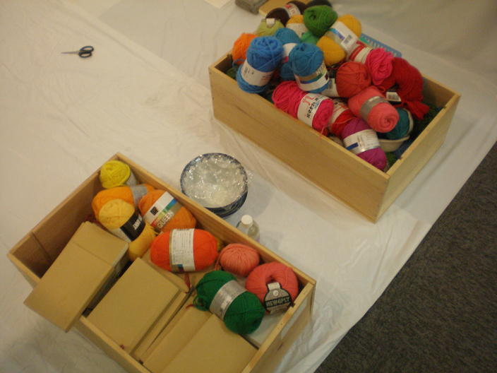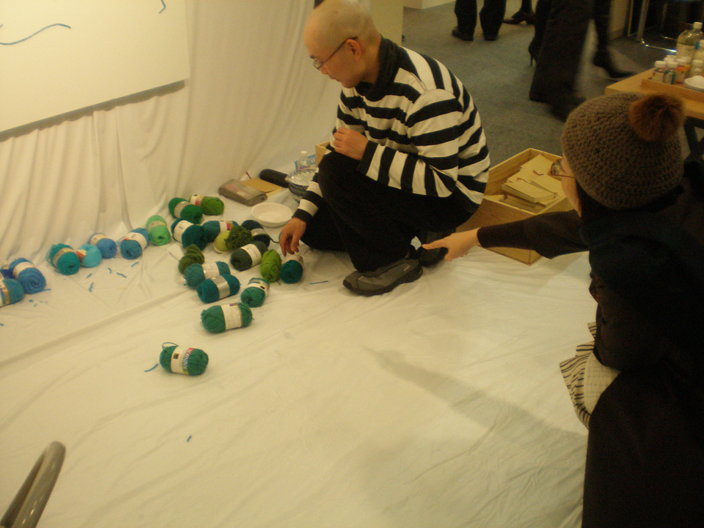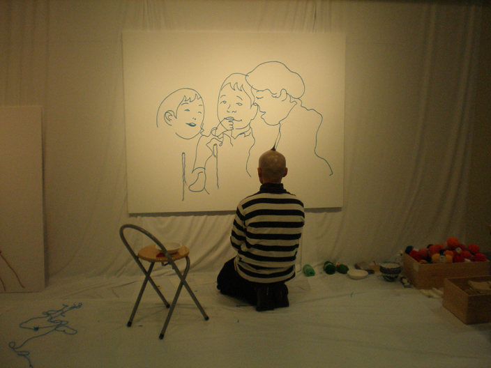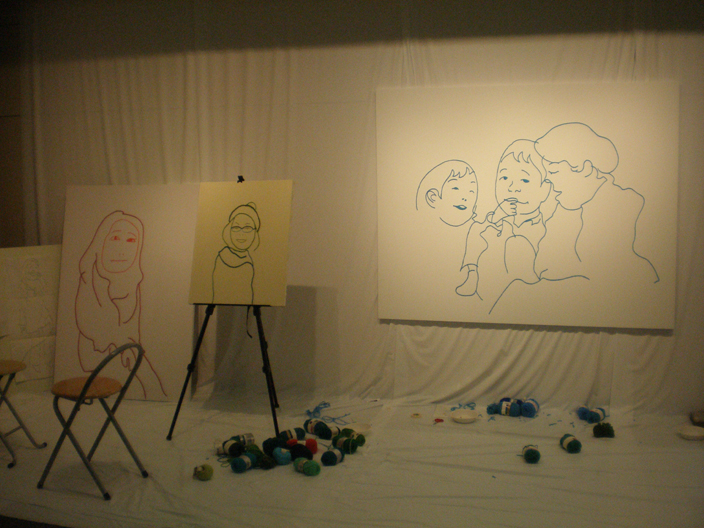 さて、今回のライブ、緊張しましたー。 現状復帰前提で用意された白シートの中が舞台。 持ってきたのは、下地まで仕上げたでっかいキャンバス。 左に、出来たての作品と、何にもしてないキャンバスと、 転写原稿。 右には、毛糸山、ノート山。 それから、顔料や溶剤や刷毛や卵も。 描いたのは、家族歓談図。 スタートしたら集中しちゃって 背後のオーディエンスのことを忘れたりする瞬間も (ごめん)あり、また、忘れられているのでは? と思うくらい静かなので振り返ると、 しっかり人だかりが出来ていたりと、 不思議な盛り上がり方になっていました。 そして、無事完成! しかし終わらない。 お客さんをつかまえて、即興糸線画を開始。 『蛍の光』が流れるまで使命を全うしました~。 ライブはこれからもやっていきます。よろしく! 展覧会の記録集 / who is いしかわ? / 帰基頁 |