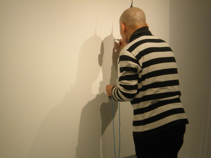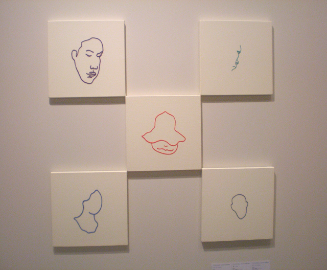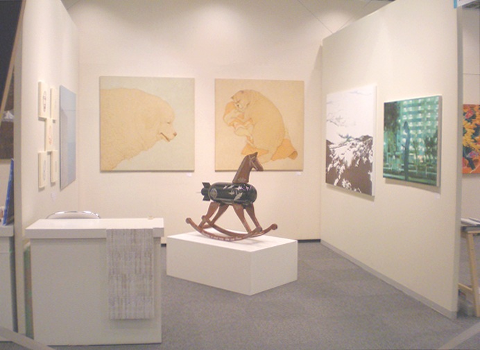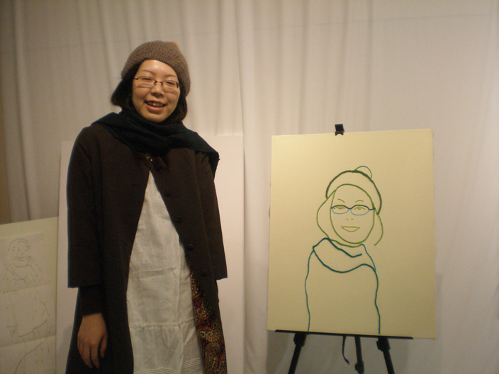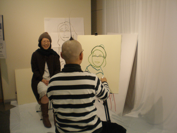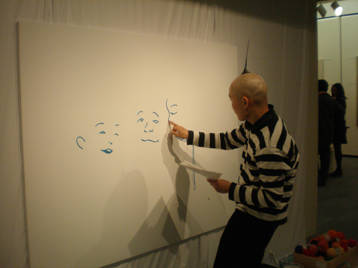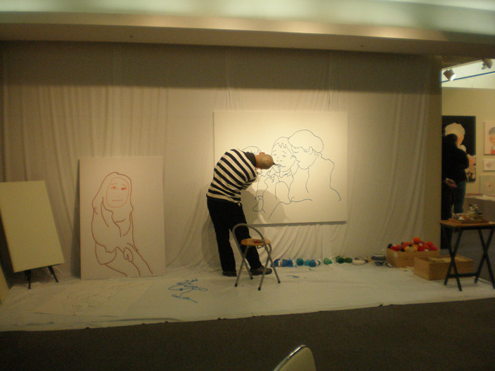 Tokyo Contemporary Art Fair 2009 11/ 21, 22, 23 於: 東京美術倶楽部 3・4F TCAF'09、今回も参加しました。 広告には、「45才以下のアーティストが主体」とあったのですが、 むむむ、この人50やん!っていう人の作品も堂々と出てました。 でもなるほど、彼が30代前半の頃の作品。何かを宣言するような 強い線で描かれていて、打たれる。 また、20代や10代の人のもあったけど、 自由かつ、誠実な、良いアーティストがいっぱいいるんだなと実感。 そんな中、僕はというと、YUKARI ART のブースでの展示と、 会場入口特設ブースでのライブドローイングを行いました。 展示したのは、正方形のキャンバスに描いた顔のシリーズ。 2008年に個展の序章のようなつもりで 糸が構図を得て象形(かたち)へ変化する シンプルなサンプルとして連作したものです。 絶対的均衡の上にありながらうごめく愉快... う~ん、自画自賛。 |